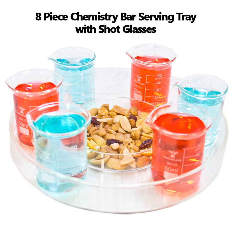 8-piece Chemistry Bar Serving Tray with Shot Glasses & Snack dish by Med Lab Supply made with 3.3 Borosilicate shatter resistant glass