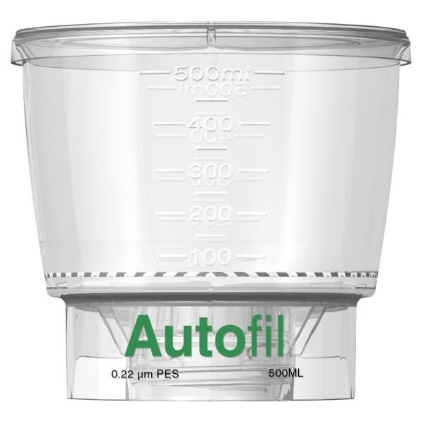 Autofil is a disposable, sterile, vacuum operated laboratory filtration system for the sterile preparation of buffers, tissue culture media, microbiological media, and other biological fluids. Bottle design includes ergonomic bottle shape, molded finger grips and patented bottle cap. Autofil asymmetric PES membrane bottle-top filters are extremely low protein binding and surfactant free. Large surface area and optimum performance means reduced filtration times and improved productivity. The funnel and bottle are made from low extractable polystyrene tested to meet USP Class VI and FDA requirements. Non-cytotoxic and pyrogen free.