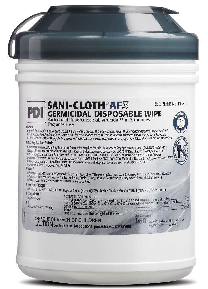 Eliminate harmful microorganisms in 3 minutes with PDI Sani-Cloth AF3 Germicidal Wipes. These alcohol-free, fragrance-free disinfecting wipes are EPA-registered and combat 45 microorganisms, including 13 multi-drug resistant organisms.