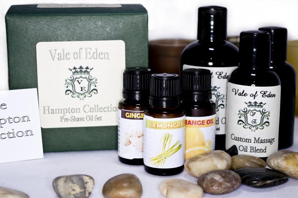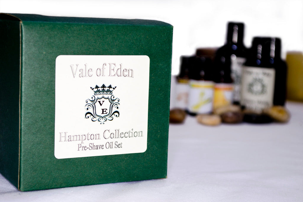 A clean, close shave provides the feeling of ultimate luxury and adds an extra boost of confidence to start your day. Pre-shave oil is the first step to a gentlemen’s shave. It will add dimension and superior results to a man’s daily grooming habits. Pre-shave oil is designed to provide your skin with an added layer of protection prior to applying a shaving soap or cream. It prepares the skin, by opening skin’s pores and softening facial hair and skin, for a close and comfortable shave. The additional benefits of using a pre-shave oil in your shaving experience is it protects your skin from razor burn and irritation, while moisturizing you skin.Many prefer to use pre-shave oils that contain only natural ingredients, preferably oils with a thin consistency. Thicker oils tend to clog the razor and may leave an oily residue on the skin. Vale of Eden is pleased to introduce The Hampton Collection Pre-Shave oil Set. This kit is formulated with all natural ingredients to allow you to prepare your own personalized Pre-shave oil blend. Our set includes 4 fl. oz Grapeseed Oil, which is naturally thin in viscosity and contains astringent properties. To provide additional hydration and moisture, as well as allowing for a smoother razor glide we included two ounces of Pure Vegetable Glycerin. For the ultimate shaving indulgence, we have included Lemongrass, Ginger and Orange Pure Essential Oil (15ml of each). We have also including a 2 ounce container for your blend. For novice person, we included our sample blend, however as you include pre-shave oil in your daily regimen, we encourage you to modify and try unique personal blends to enhance your shaving experience.